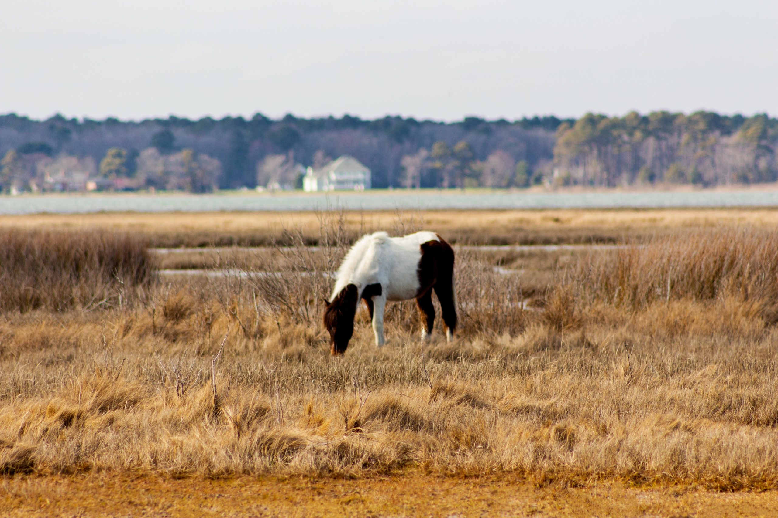 The horses in Assateague are known as “Chincoteague Ponies” due to their smaller stature compared to other breeds. This occurs because of the harsh conditions of the island. Their diet is restricted to the plants and brush of the salt marshes, which is not particularly plentiful and nutritious. As for patterns, the pinto variety is the most commonly found, but they can have solid colorations too.